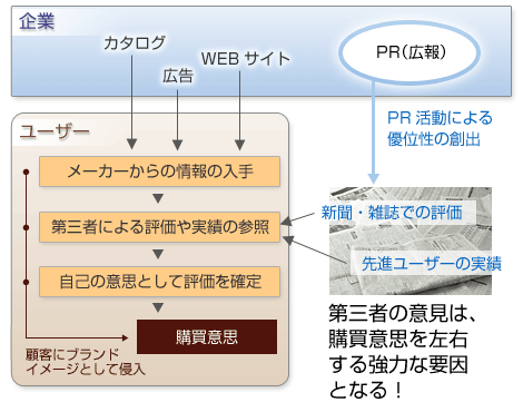 いまユーザーは、新聞や雑誌の記事、テレビ、インターネットの中の第三者の意見に耳を傾けています。 第三者による評価をもとに自己の意思が方向づけられ、そこに信頼感が生まれることで、購買の意思決定に大きな影響が与えられます。