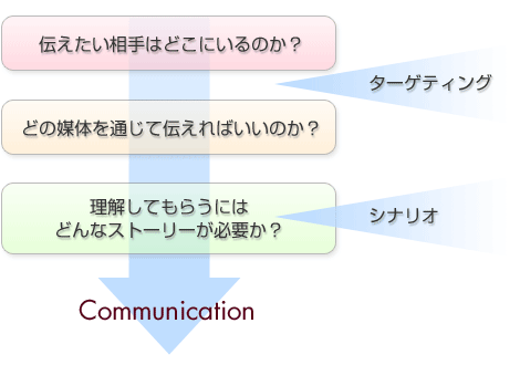 ウィズブレインズのPRメソッドは、「ターゲティング」と「シナリオ」に基本を置きます。 伝えたい相手がどこにいて、そのためにはどのような媒体を介してメッセージを発信すればいいのか? こうしたターゲットを明確にしないと、メッセージのポイントは曖昧になり、相手に到達しないまま拡散していきます。 そして最も重要なことは、メッセージを伝えるためのシナリオです。 ターゲット・ユーザーが潜在的に持つニーズをさまざまな仮説のもとで分析し、企業の理念を込めたブランディング・メッセージを、ユーザーが受け入れやすいシナリオとして組み上げていく。